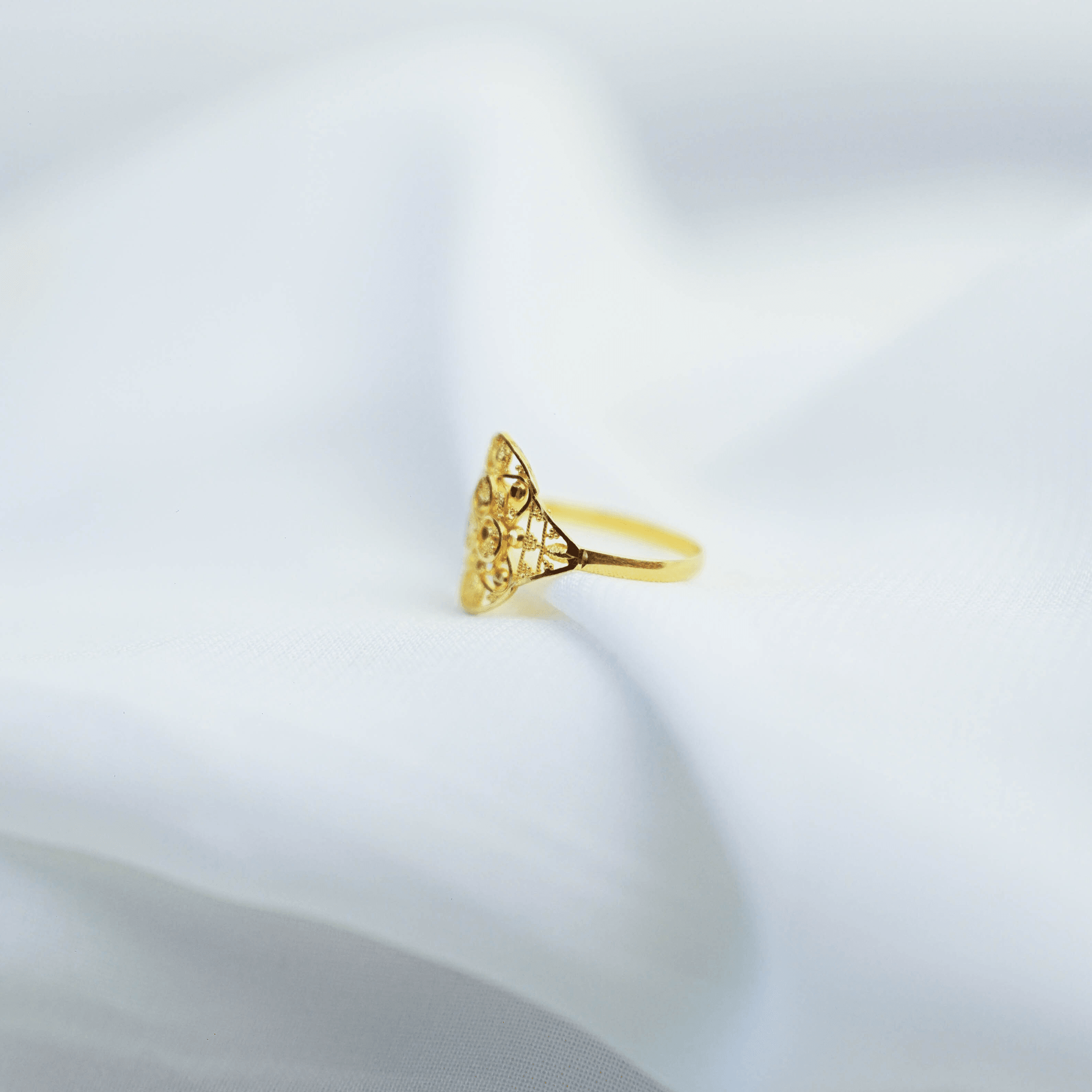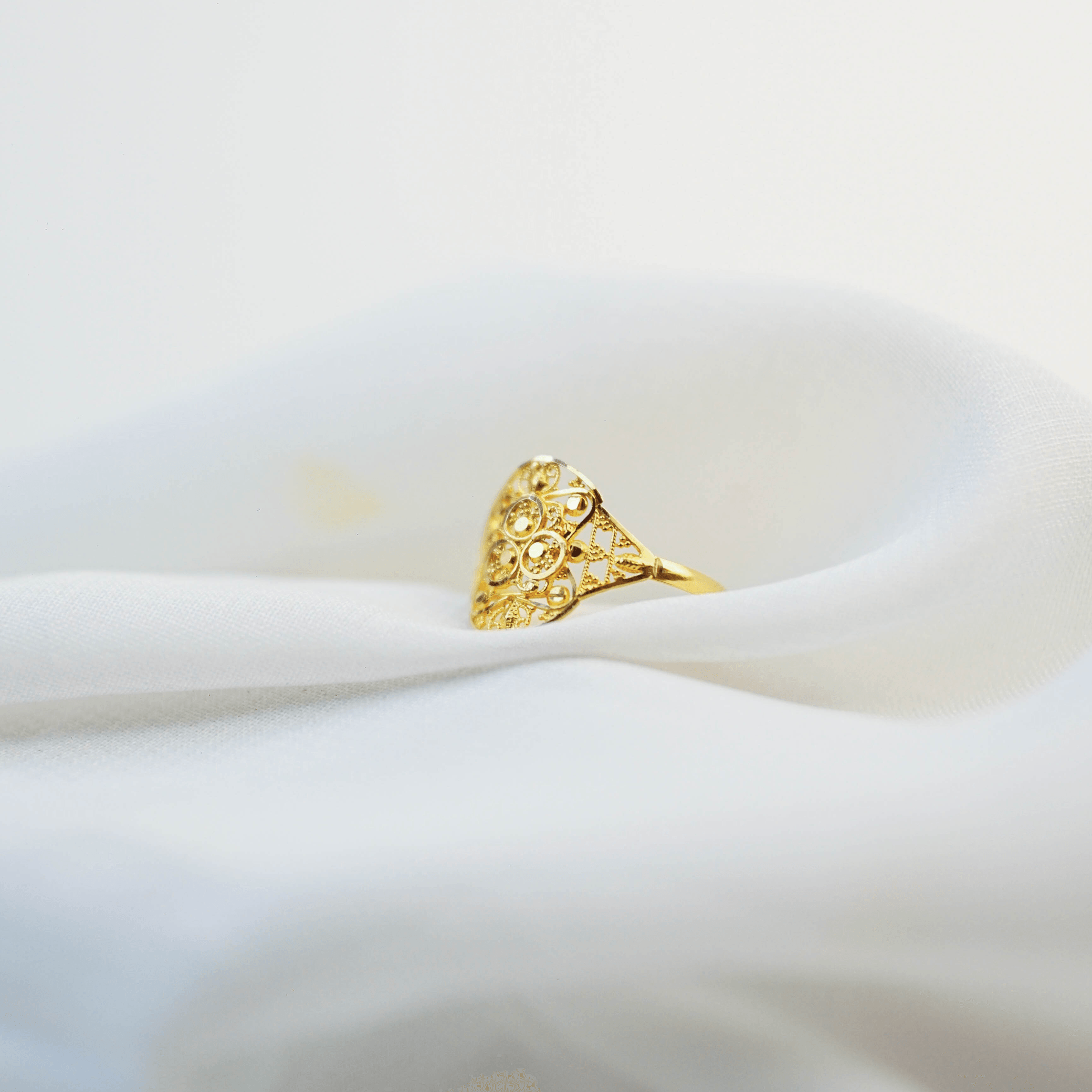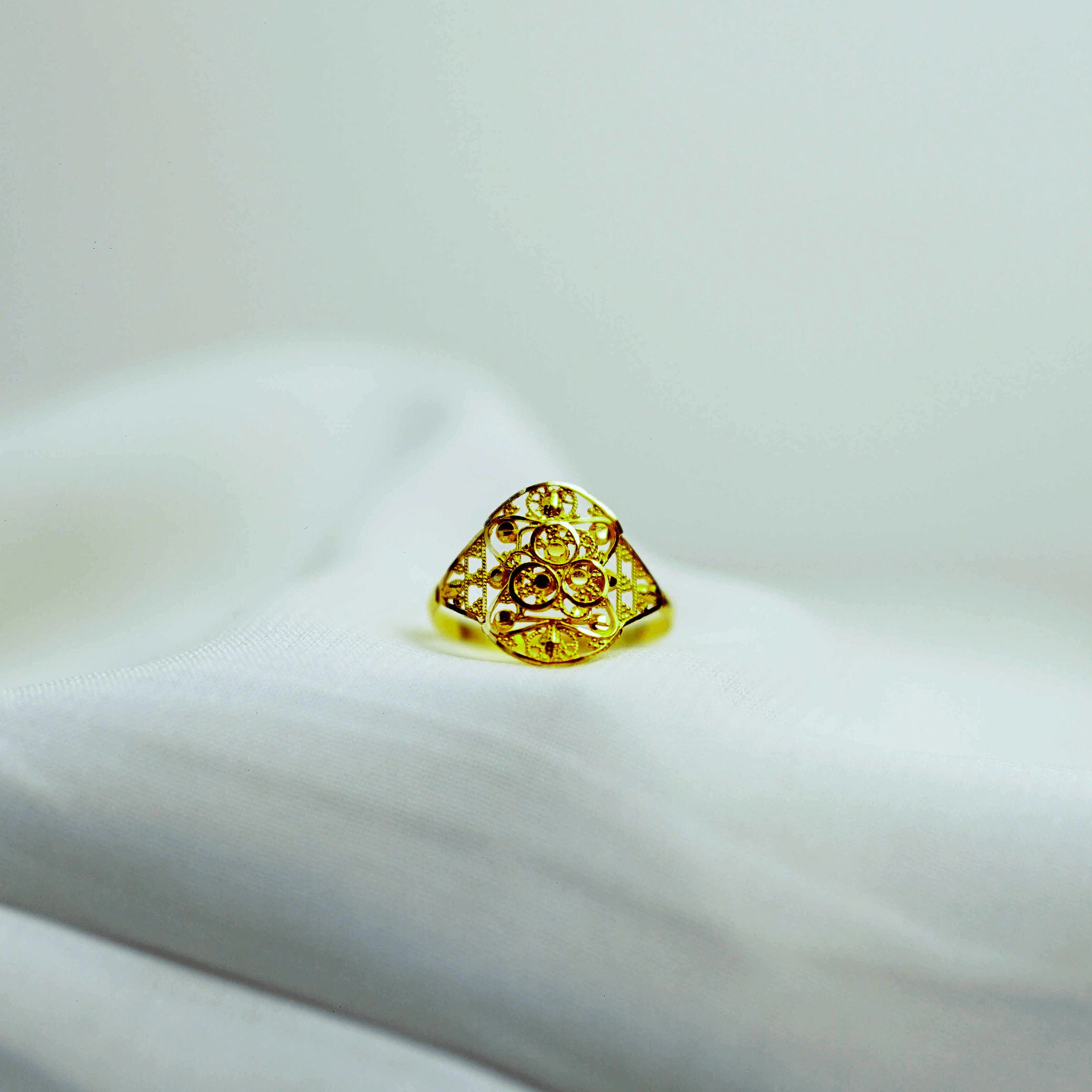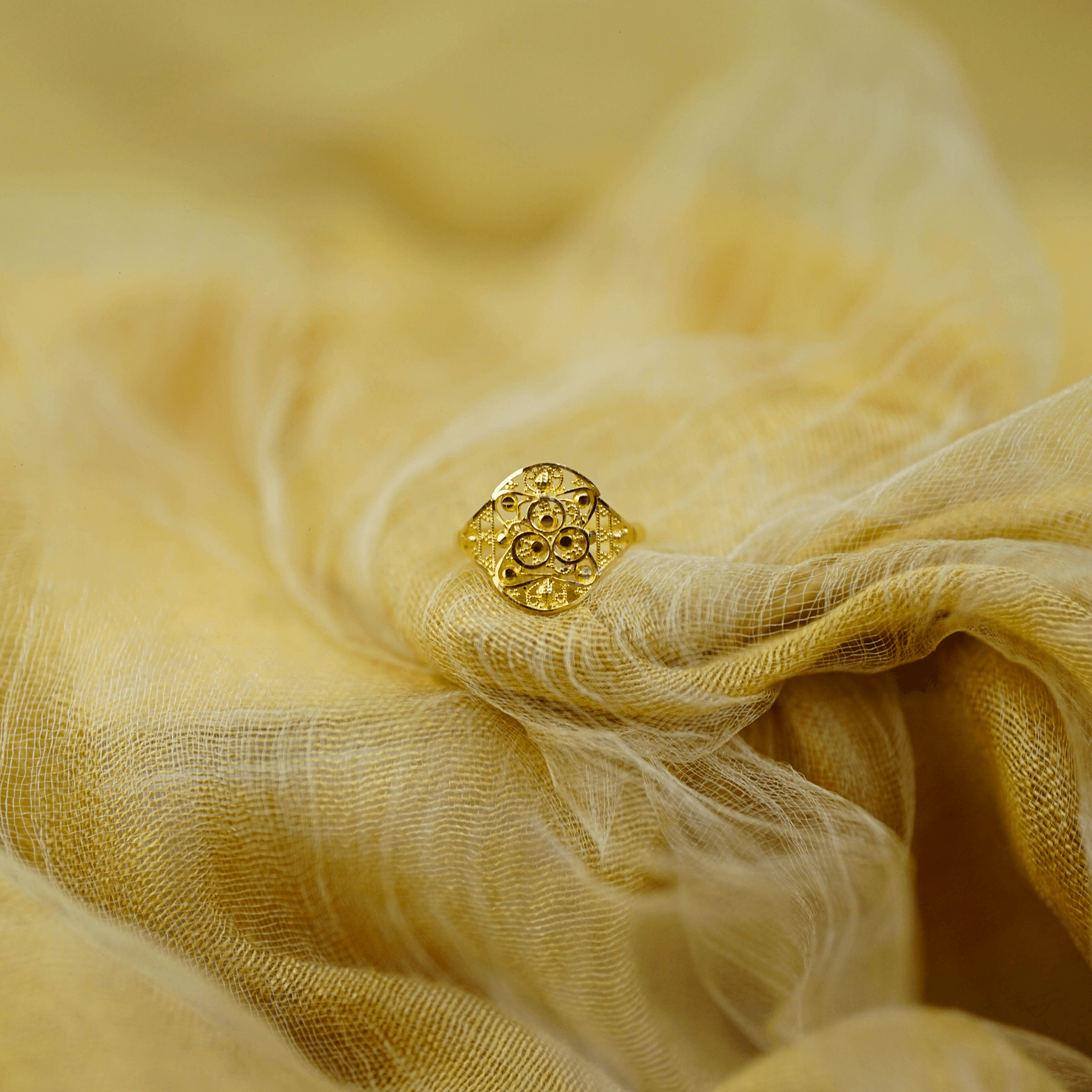 Behold the epitome of luxury with our exquisite Signet Gold ring, hand-crafted to perfection using only the finest 21 karat gold. Its tri-circular design and intricate patterns are sure to astound and leave a lasting impression. Experience the ultimate in sophistication with this one-of-a-kind piece of jewelry.